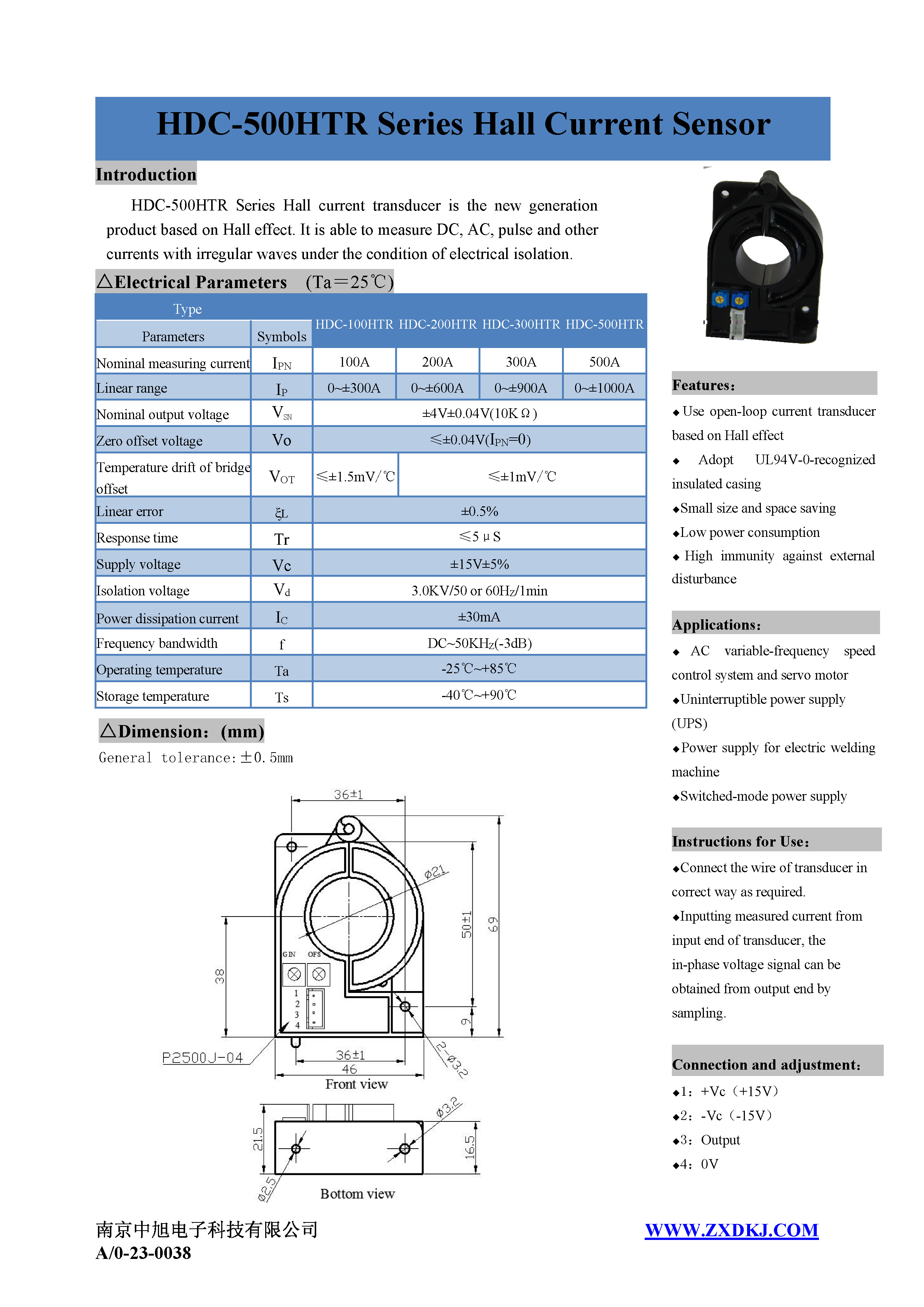 HDC-500HTR系列霍爾電流傳感器是應(yīng)用霍爾效應(yīng)原理的新一代電流傳感器,能在電隔離條件下測量直流、交流、脈沖以及各種不規(guī)則波形的電流。
